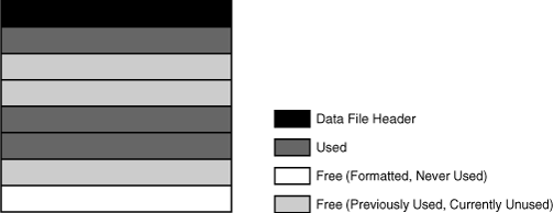 The following figure illustrates the different types of space in a data file. Extents are either used, which means they contain segment data, or free, which means they are available for reuse. Over time, updates and deletions of objects within a tablespace can create pockets of empty space that individually are not large enough to be reused for new data. This type of empty space is called fragmented free space.