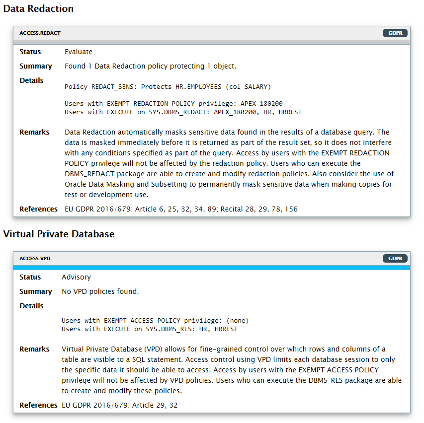 The Oracle Database Security Assessment Tool (DBSAT) analyzes database configurations, users, their entitlements, security policies and identifies where sensitive data resides to uncover security risks and improve the security posture of Oracle Databases within your organization.