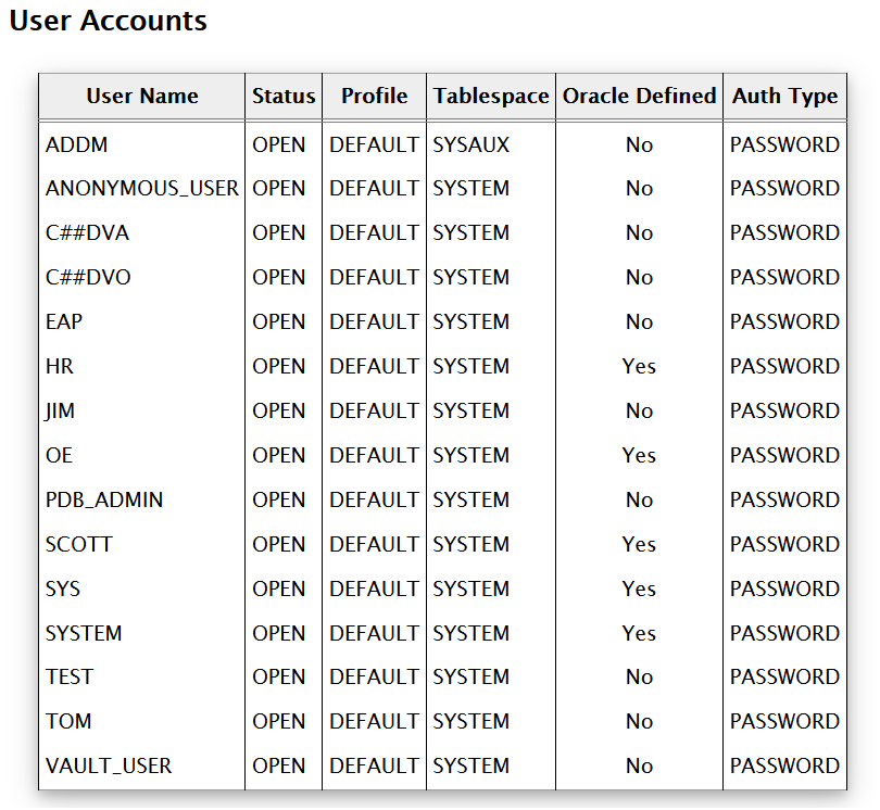 READorSELECTonSYS.DBA_USERS_WITH_DEFPWD(11g and later) -