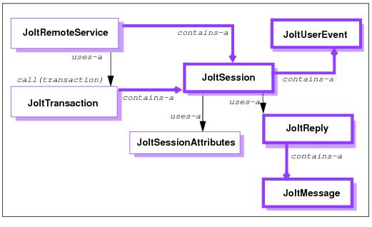 - Uses-a relationship— an object can use another object without containing it. For example, a JoltSession can use the JoltSessionAttributes object to obtain the host and port information.