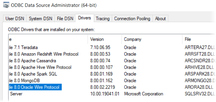 Driver=/scratch/username/oracle_home/essbase/modules/oracle.essbase.datadirect.odbc/8.0.2/lib/ARora28.soTo find the DriverName on Windows, look in the Windows 64-bit ODBC Data Source Administrator utility, on the Drivers tab.