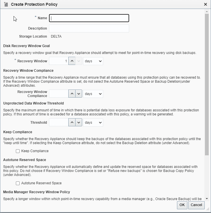 If not using Recovery Window Compliance or Keep Compliance, then optionally the Backup Deletion section specifies if the Recovery Appliance allows backup deletion with