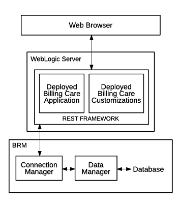 Billing Care's REST framework communicates with web browsers and Oracle Communications Billing and Revenue Management (BRM) using a connection pool to the Connection Manager.