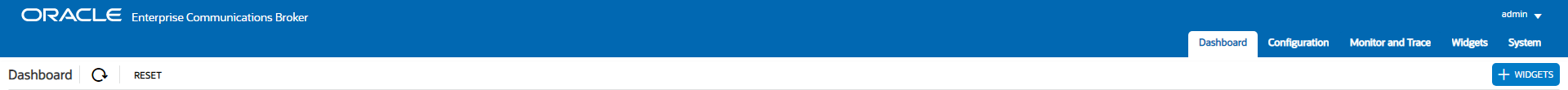 The header displays five tabs and the User Menu removes the Preferences item. The following screen capture shows the new header, displaying the Dashboard, Configuration, Monitor and Trace, Widgets and System tabs.
