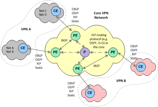 The various routers within the VPN communicate using BGP, an IP routing protocol that defines how routes can be distributed. BGP transports information about CE routers only to members of the same VPN, ensuring security.