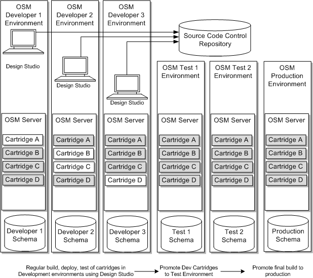 Cartridges can also help you manage development cycles. You can use cartridges to divide OSM development work into logical pieces among development team members contributing to the implementation. For example in Figure 15-1, OSM developer 1, 2, and 3 work in parallel on different component cartridges in the solution. You can also port cartridges between OSM environments. This is useful for sharing between developer team members, promoting cartridges from development to test environments, or from test to production.