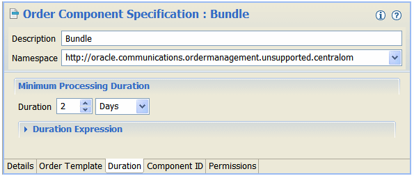 The Duration tab displayed beside the Order Components tab and Dependencies tab in Figure 14-2 is no longer used. This tab still appears in Design Studio to support OSM cartridges that target pre-OSM 7.2.2 servers.