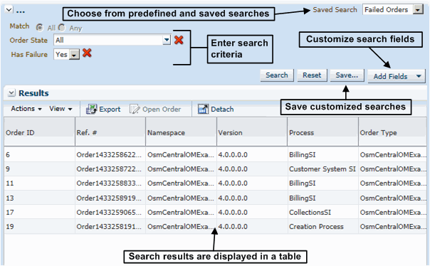 Failed Orders: Finds all orders in the Failed state. This is the default search until you specify another as the default. See "Saving a Search" for more information.