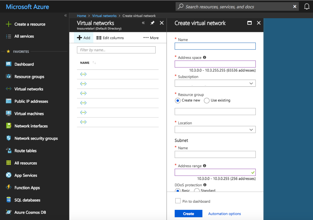 - Select “Virtual Network” from “All Services” in the Azure Portal Menu.