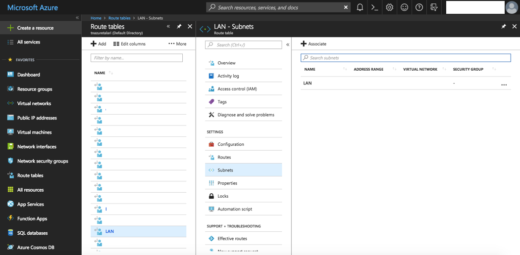 - Select “Route Tables” from “All Services” in the Azure Portal Menu.