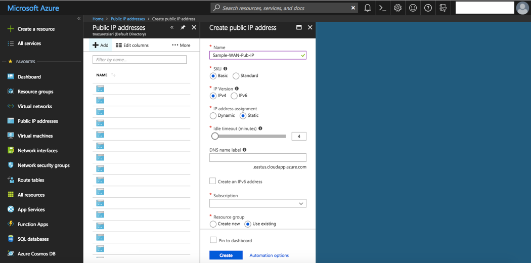 - Select “Basic” for “SKU” and “IPv4” for IP Version.