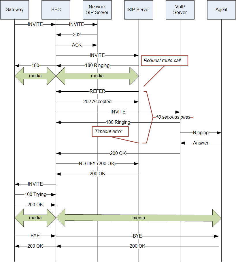 When you compare the call flow above to the one depicting the scenario when the Oracle Communications Session Border Controller has the refer-notify-provisional changed from its default, you can see that the Oracle Communications Session Border Controller now response with a NOTIFY in response to the 202 Accepted and it sends another after the 180 Ringing.This causes the event to be diverted successfully.