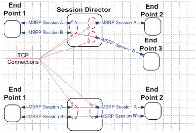 With regard to the above figure, the upper Oracle Communications Session Border Controller’s TCP connection between Endpoint 1 and the MSRS B2BUA is shared by 2 MSRP sessions. At bottom, each MSRP session uses a separate TCP connection. When the B2BUA assumes the active role, it always initiate a separate connection to the MSRP endpoint peers, endpoints 2 and 3 as shown above.