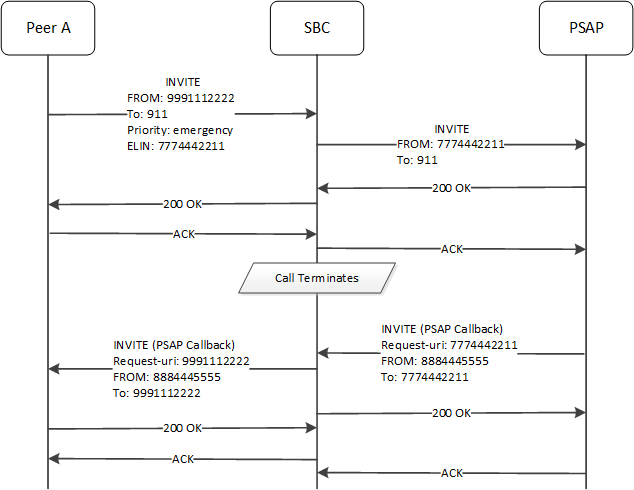 PeerA has sent an emergency call to 911. In addition, there is no local policy configured that matches a to-address with the ELIN number 7774442211. The SBC identifies the call from PeerA as an emergency call since it contains “PRIORITY: emergency” header. It modifies the “FROM” number in INVITE request to the ELIN number, and forwards the INVITE. The SBC receives the PSAP callback from 911, but replies with no route found because there is no local route that matches 7774442211.