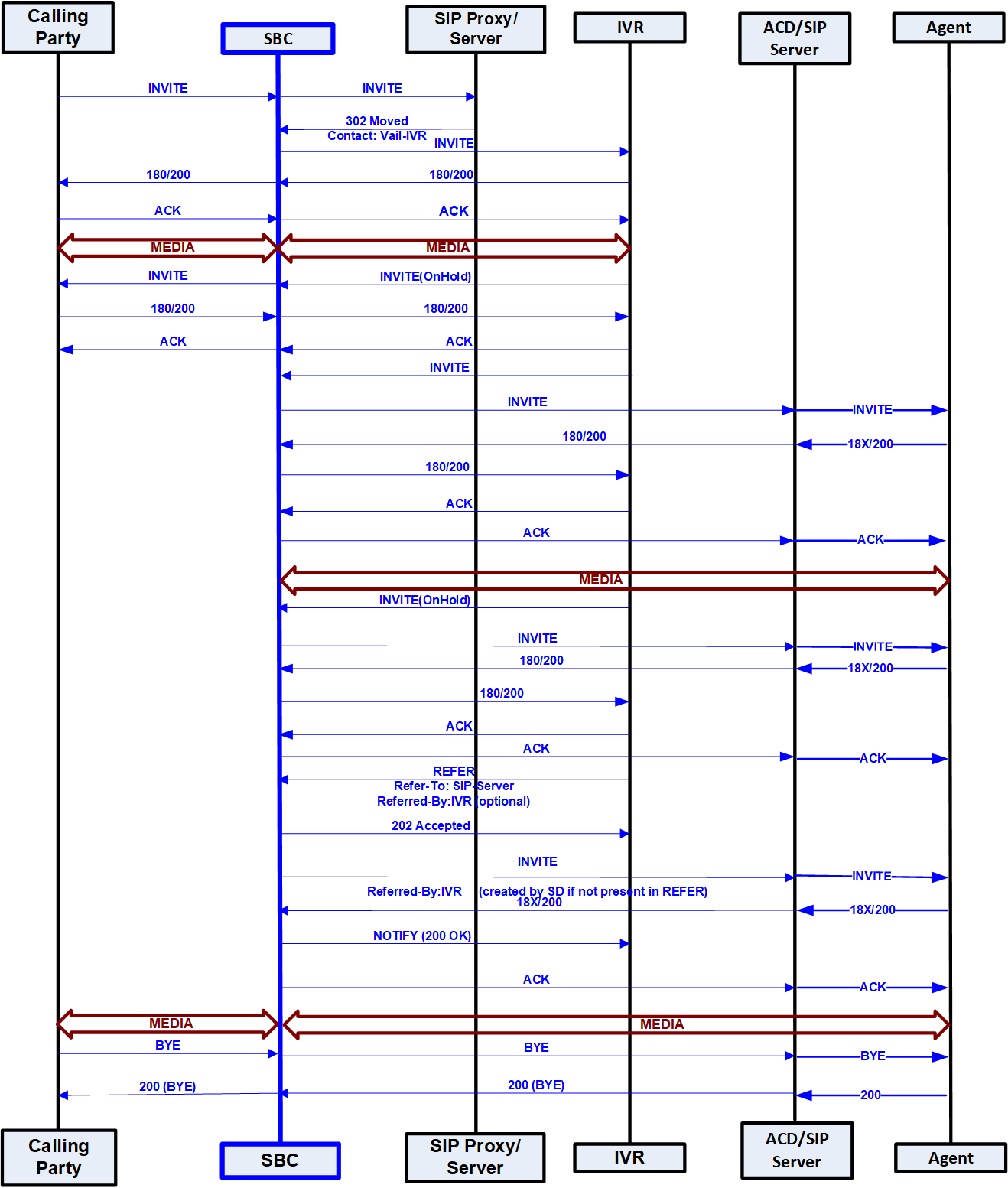 The Oracle Communications Session Border Controller has a configuration parameter giving it the ability to provision the handling of REFER methods as call transfers. The parameter is called refer-call-transfer. When this feature is enabled, the Oracle Communications Session Border Controller creates an INVITE message whenever it receives a REFER. The Oracle Communications Session Border Controller sends this INVITE message to the address in the Refer-To header. Included in the INVITE message is all the unmodified information contained in the REFER message. The previously negotiated codec is also still used in the new INVITE message. NOTIFY and BYE messages are sent to the UA upon call transfer completion.