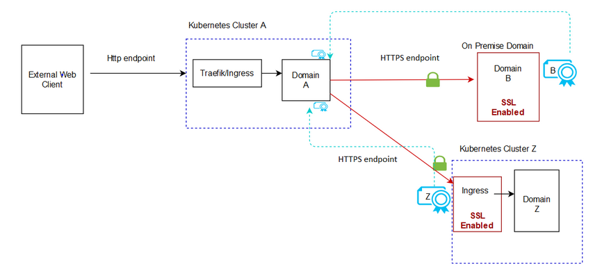 When a domain inside a Kubernetes cluster sends REST API or Web Service requests over HTTP to a domain that is outside the cluster that is enabled with SSL, then you should set up some required configuration. For instructions, see "Configuring Access to External SSL-Enabled Systems".