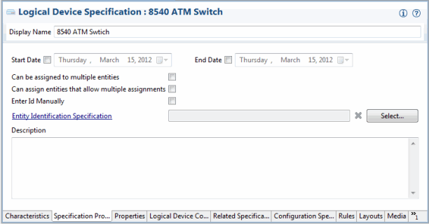 In the Logical Device specification editor that opens, you use the Specification Properties tab to enter basic identifying information, including the display name and validity dates.