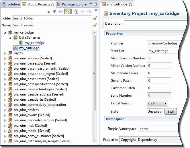A cartridge can be dependent on other cartridges. These dependencies are specified on the Project editor Dependency tab. For example, all Inventory cartridges are dependent upon the ora_uim_model project. So, when you create a new Inventory project, the Dependency tab automatically includes ora_uim_model in the list of project names. Projects that are listed on the Dependency tab indicate that the project can be referenced by the Inventory project at design time.