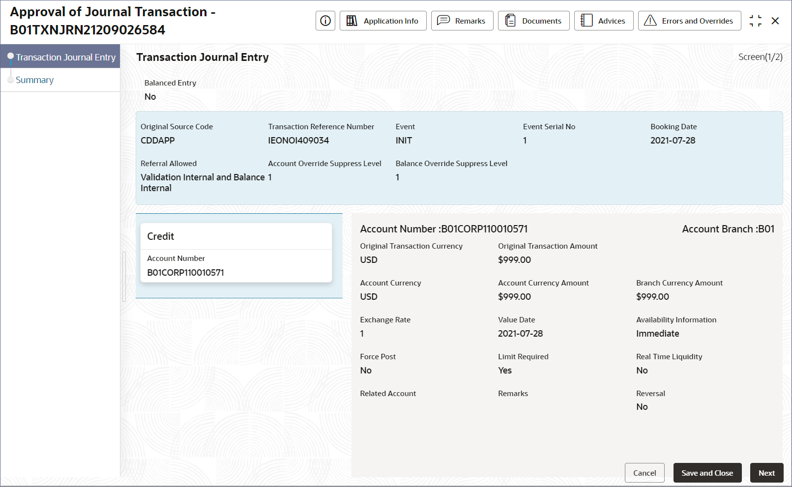 Account Override Suppress Level Specify the level of suppression to override transaction accounting errors. The system ignores accounting errors allowed within the suppress tier. Balance Override Suppress Level Specify the level of suppression to override balance limit errors. The system ignores balance limit errors allowed within the suppress tier. - Click Initiate.The Entry of Journal Transaction <Application Number> screen displays the transaction details specified on the Create page.