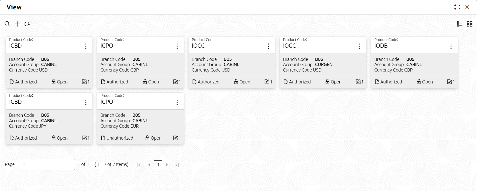 Field Description Product Code Displays the product code. Branch Code Displays the branch code. Account Group Displays the account group. Currency Code Displays the currency code. Rule Code Displays the rule code. Authorization Status Displays the authorization status of the record. The available options are: