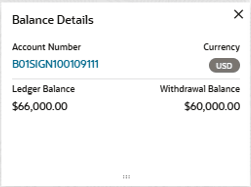 Field/Column Name Description Opening Balance (ACY) Opening balance in the primary account currency value. Opening Balance (LCY) Opening balance in the local currency. Current Balance(Account Currency) Current balance in the account currency. Current Balance(Local Currency) Current balance in the local currency. Uncollected Uncollected funds that are applicable to the account. For example, a check deposit that is awaiting clearance. ECA Blocked Amount blocked in the account due to External Credit Approval (ECA) sought by external applications such as Liquidity Management applications. Legal Blocked Amount blocked in the account for legal obligations and requirements. For example, a minimum balance is to be maintained as per legal requirements. Unauthorized Credit Total amount of Credits that await authorization. Unauthorized Debit Total amount of Debits that are await authorization. Available Balance Available Balance represents the maximum amount of money that can be withdrawn. This excludes pending transactions, holds, and any other restrictions or blocks on the account. - Click Close .The Balance Details dialog closes.