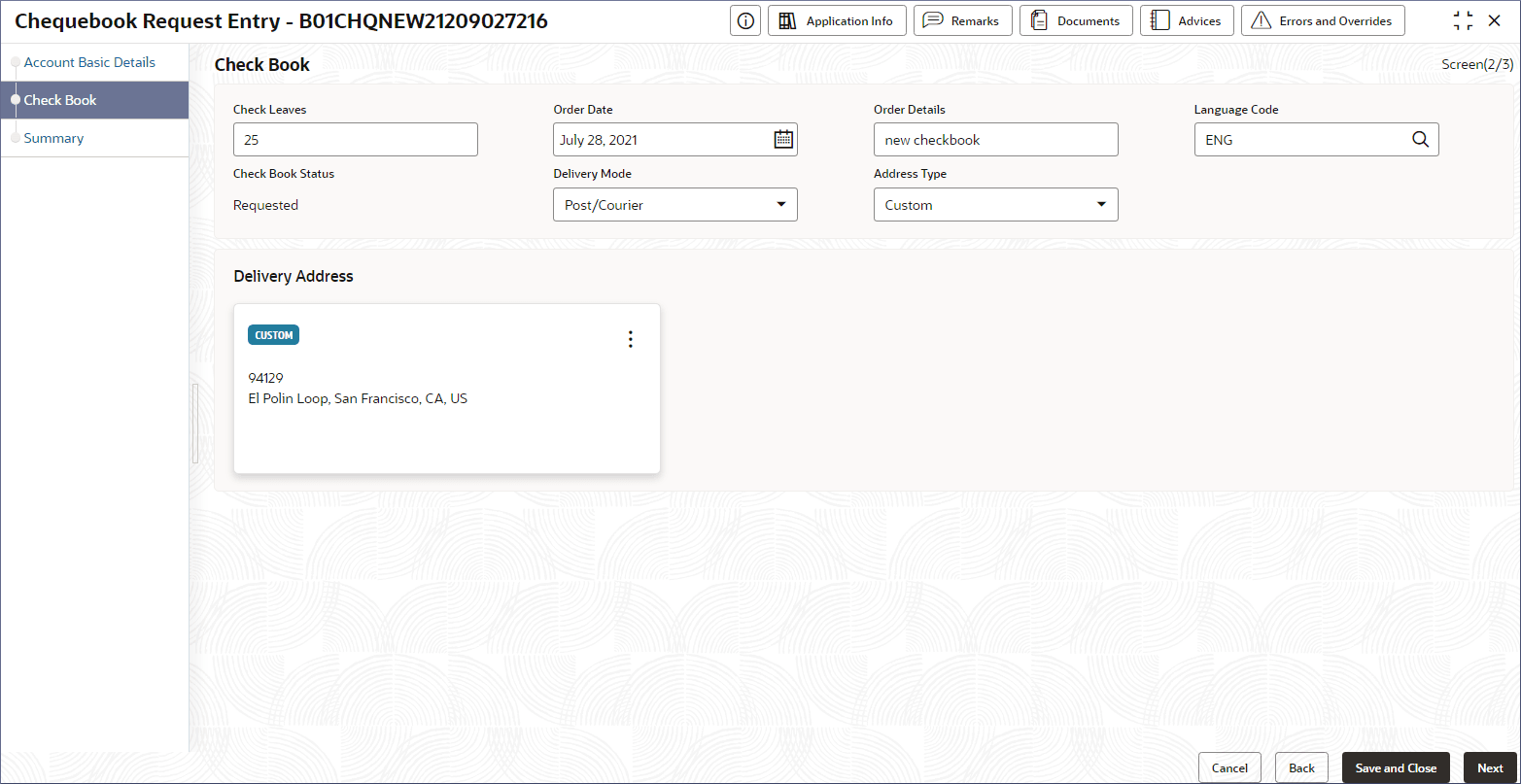 Figure 4-37 Check Book Request Entry - Custom Delivery Address