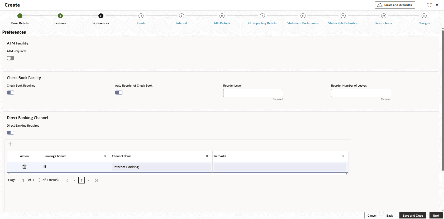 Reorder Level Specify the number of leaves remaining when a check book is auto-reordered. Reorder Number of Leaves Specify the number of leaves required in the issued check book. Direct Banking Required Enable this preference to allow direct banking facility to the accounts belonging to this class. When enabled, a new table is added with the following columns to capture channel details: - Banking Channel- Channels include Internet Banking, Interactive Voice Response, Mobile, ATM, Credit Card, and so on.