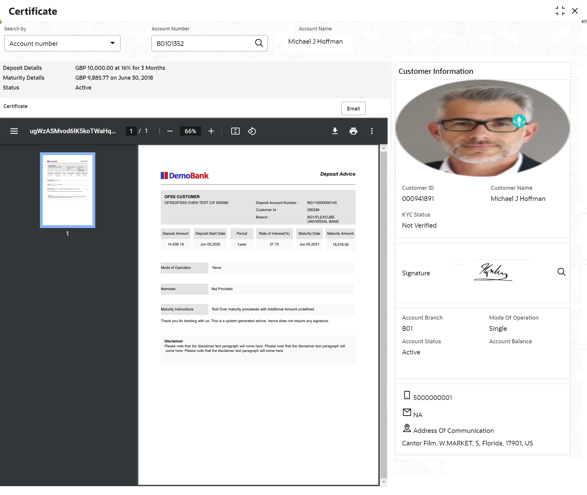 You can specify a CD account number and generate the deposit certificate and displayed along with an option to email the PDF to the customer's registered email address using the Certificate screen. You can also perform this activity based on request from the deposit holder.