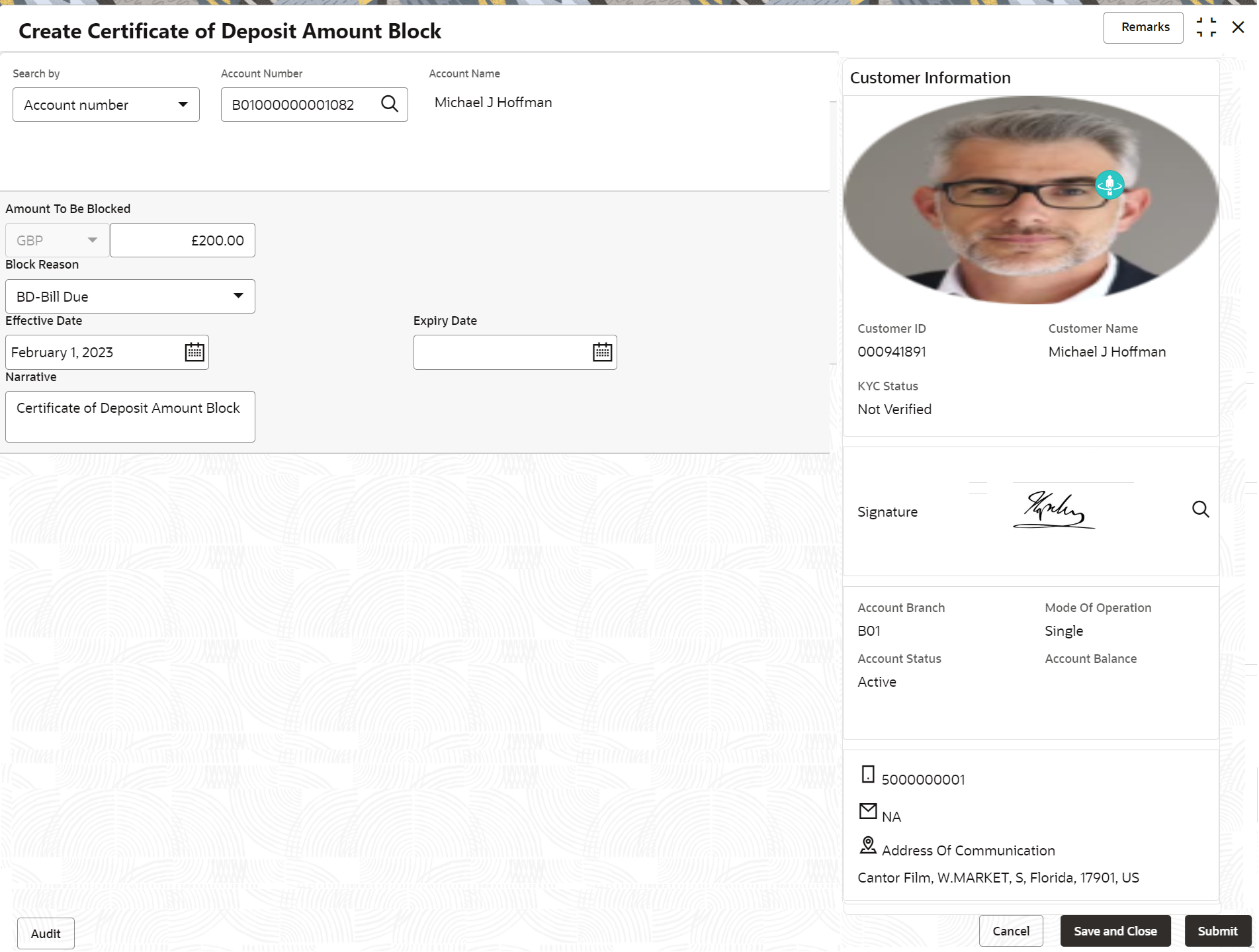 This date cannot be less than current process date and effective date.Narrative Specify the narration, if any for the block. - Click Submit.The screen is successfully submitted for authorization.