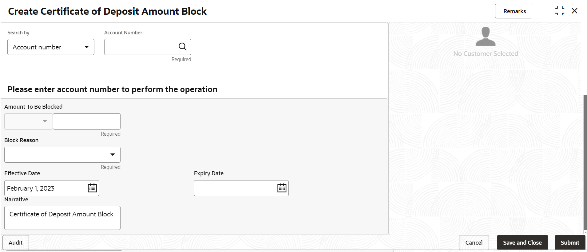 Amount Block in the search icon bar and select the screen.The Create Certificate of Deposit Amount Block screen is displayed.