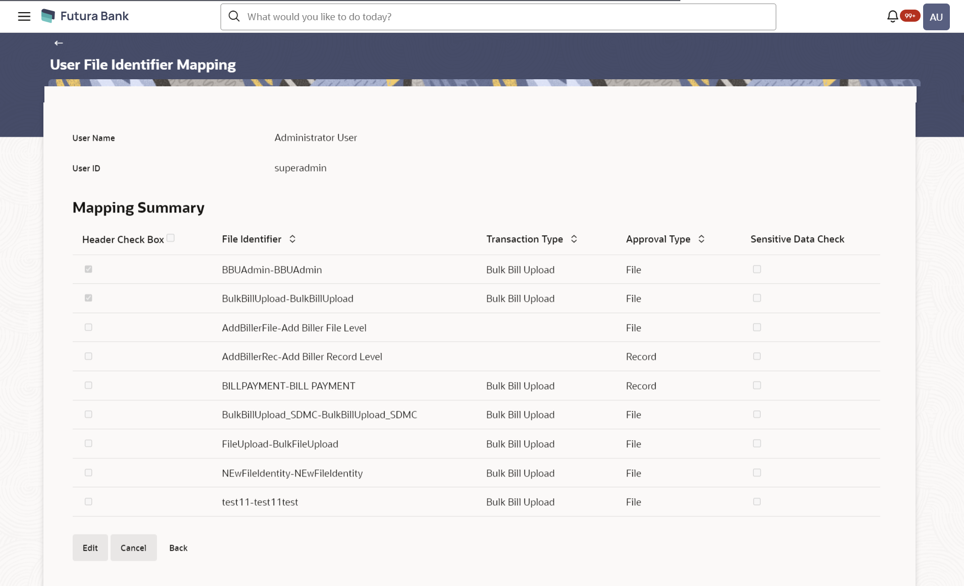 Field Name Description User Name User name of the logged-in user. User Id User id of the user. Mapping Summary Header Check Box The check box to select the records for mapping. File Identifier Unique code assigned to the uploaded file. Transaction Type Type of transaction: The transaction type could be:- Admin Biller
