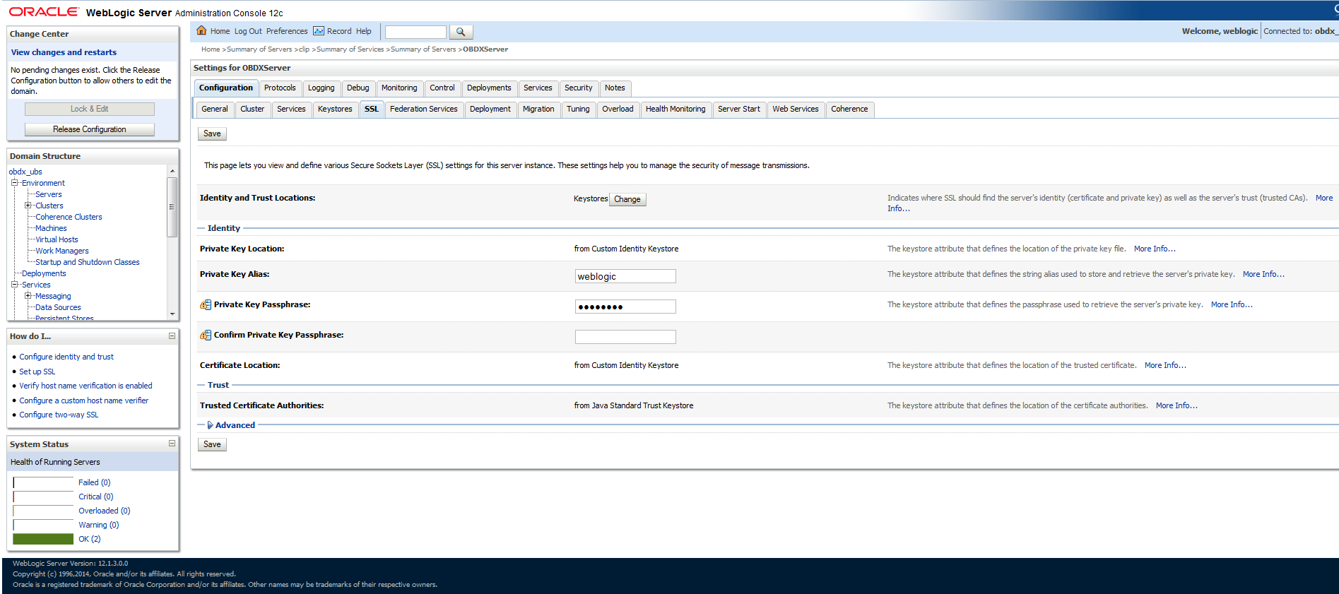 keytool -import -trustcacerts -alias sampletrustself -keystore SampleTrust.jks -file SampleSelfCA.cer.der -keyalg RSAkeytool -import -alias `hostname -f` -file `hostname -f`.cer -keystore <JAVA_HOME>/jre/lib/security/cacerts -storepass changeit -noprompt - Configure Application Domain’s WebLogic with Custom Identity and Trust