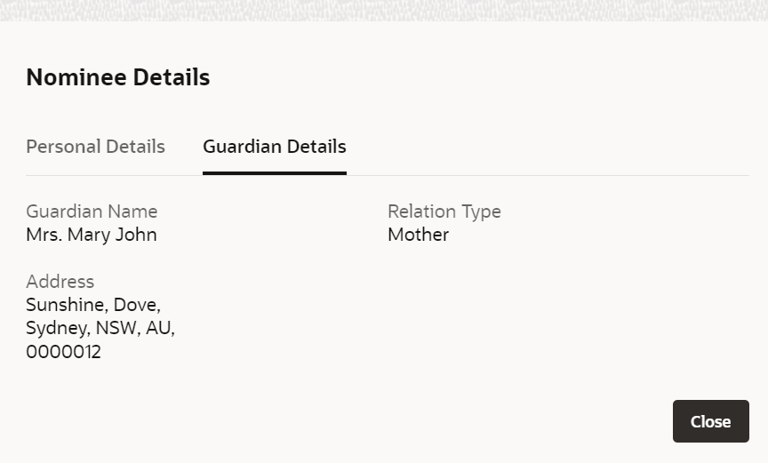 This tab is displayed if the nominee is a minor.Guardian Name Displays the name of the guardian. Relation Type Displays the type of relationship with nominee. Address Displays the guardian's address. - Click Close.