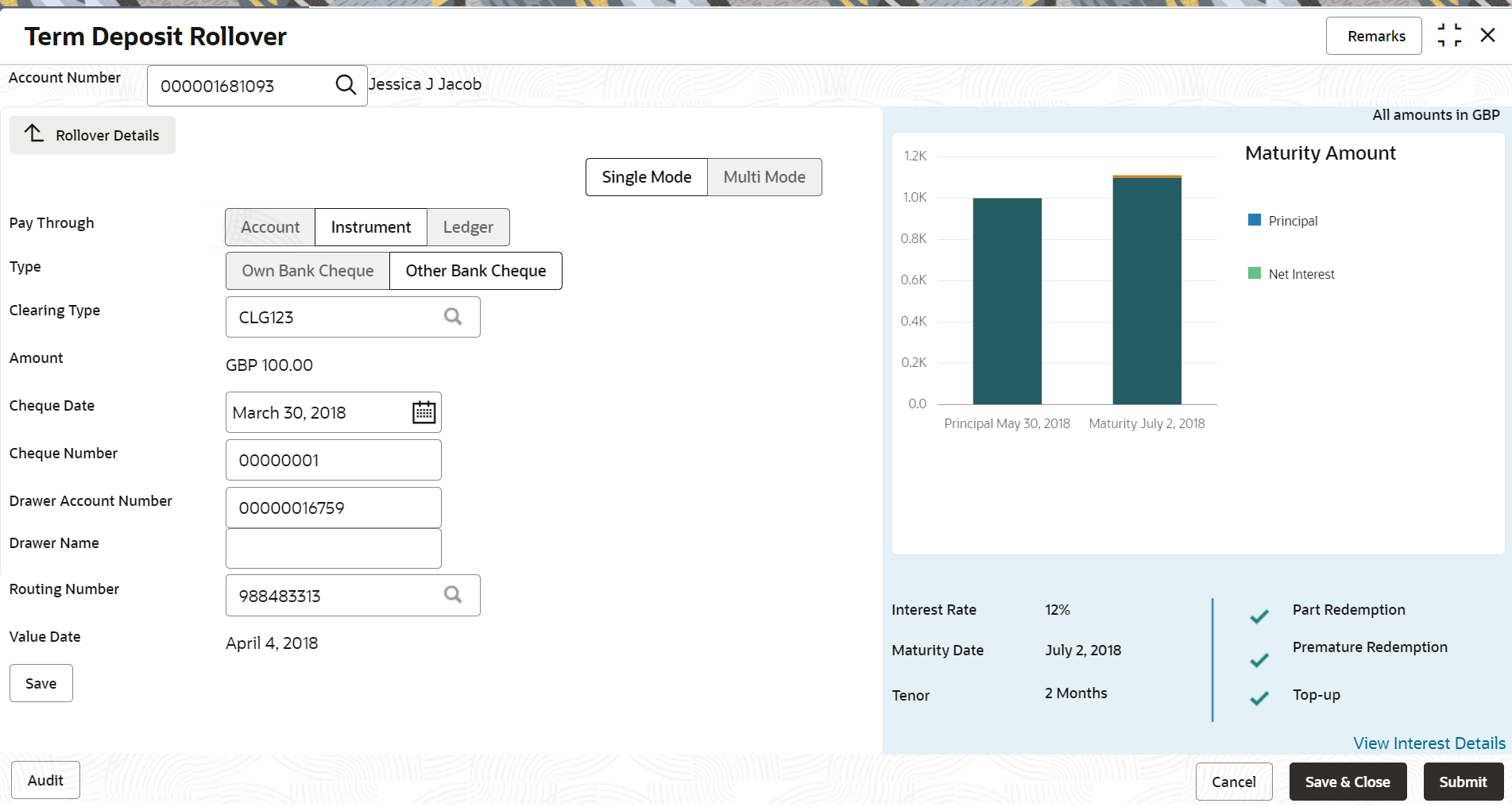 This field is displayed, only if the TD currency and CASA currency are different.Cheque Date Specify the cheque date. Cheque Number Specify the cheque number to be deposited. Drawer Account Number Specify the drawer account number. Drawer Name Specify the drawer name. Routing Number Specify the routing number available on the cheque. Value Date Display the value date of the cheque. - To fetch the clearing type: