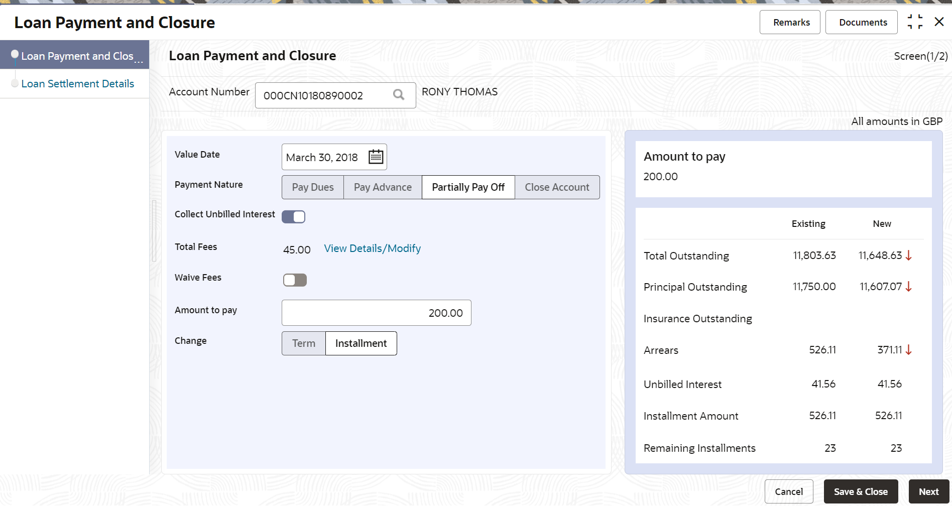 You can make payment by paying partial loan amount. Once the payment is done, the principal amount is reduced from the loan amount. The Partially Pay Off option will not available, if the loan account is in post maturity date.