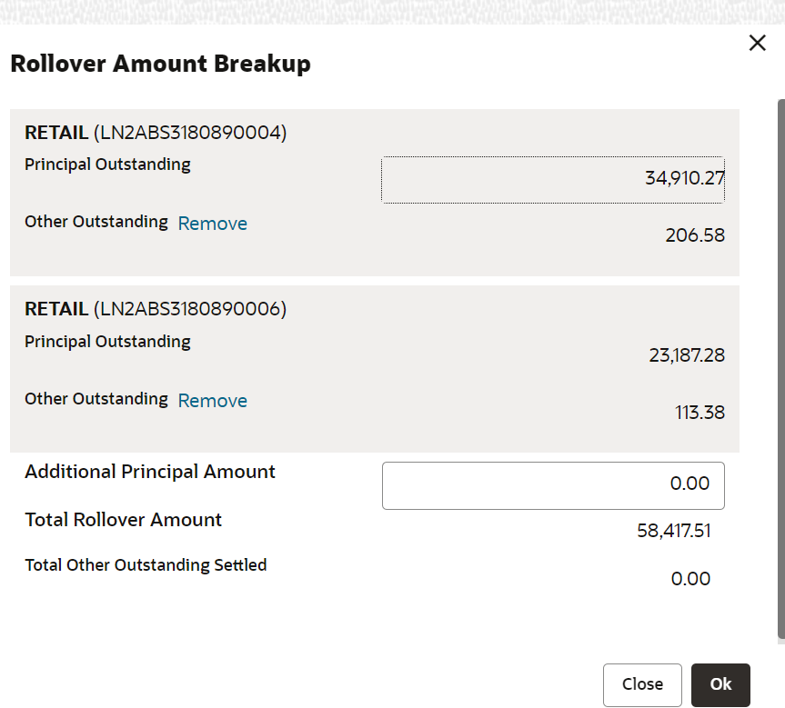 Additional Principal Amount Specify the additional principal amount. Total Rollover Amount Displays the total rollover amount of all loan accounts, including Additional Principal Amount (if captured). Total Other Outstanding Settled Displays the total outstanding settled amount. - Click OK.