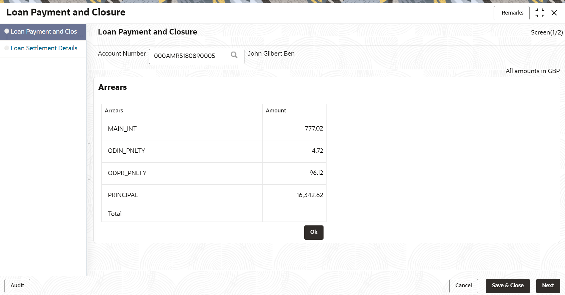 You can view the breakup details of the due amount, only if you have selected the Installment Payment option from the Payment Type field in the Loan Payment and Closure tab.