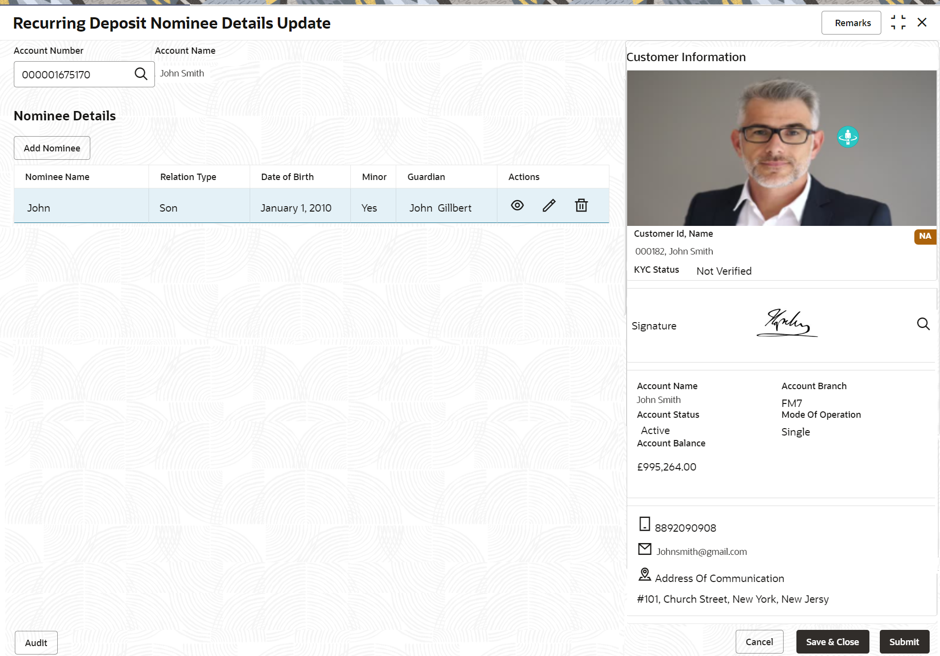 If no nominee is added to the selected account, then there are no details displayed in the Nominee Details section.