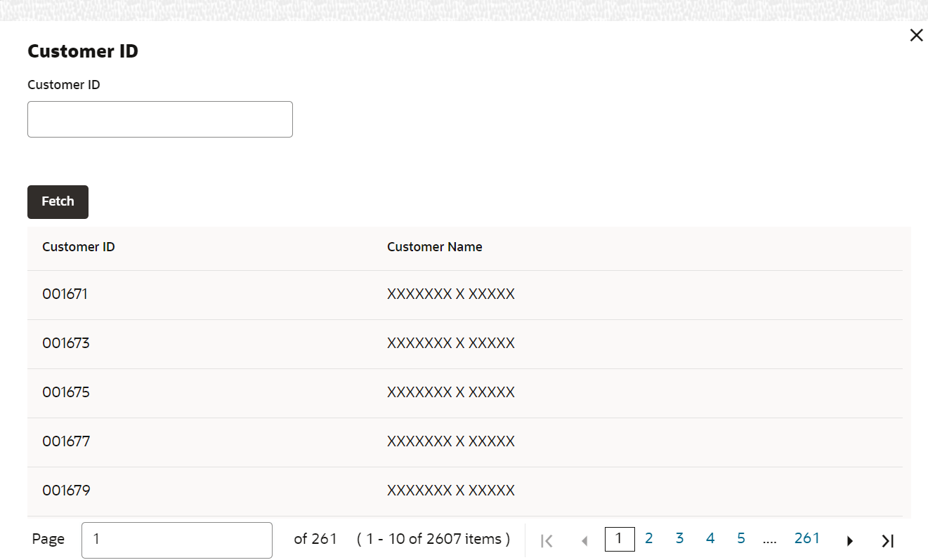 4. Select the required customer ID from the Customer ID or Customer Name list displayed in the table.