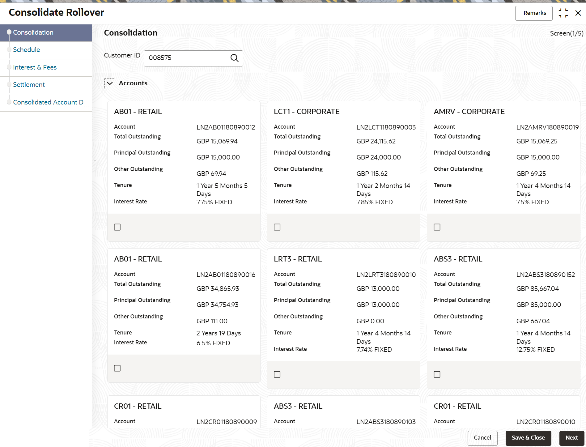 You can consolidate the loan accounts having the same currency using the Consolidated Rollover screen. Once the accounts are consolidated, you can define the driving factors for various aspects for the new consolidated loan account.