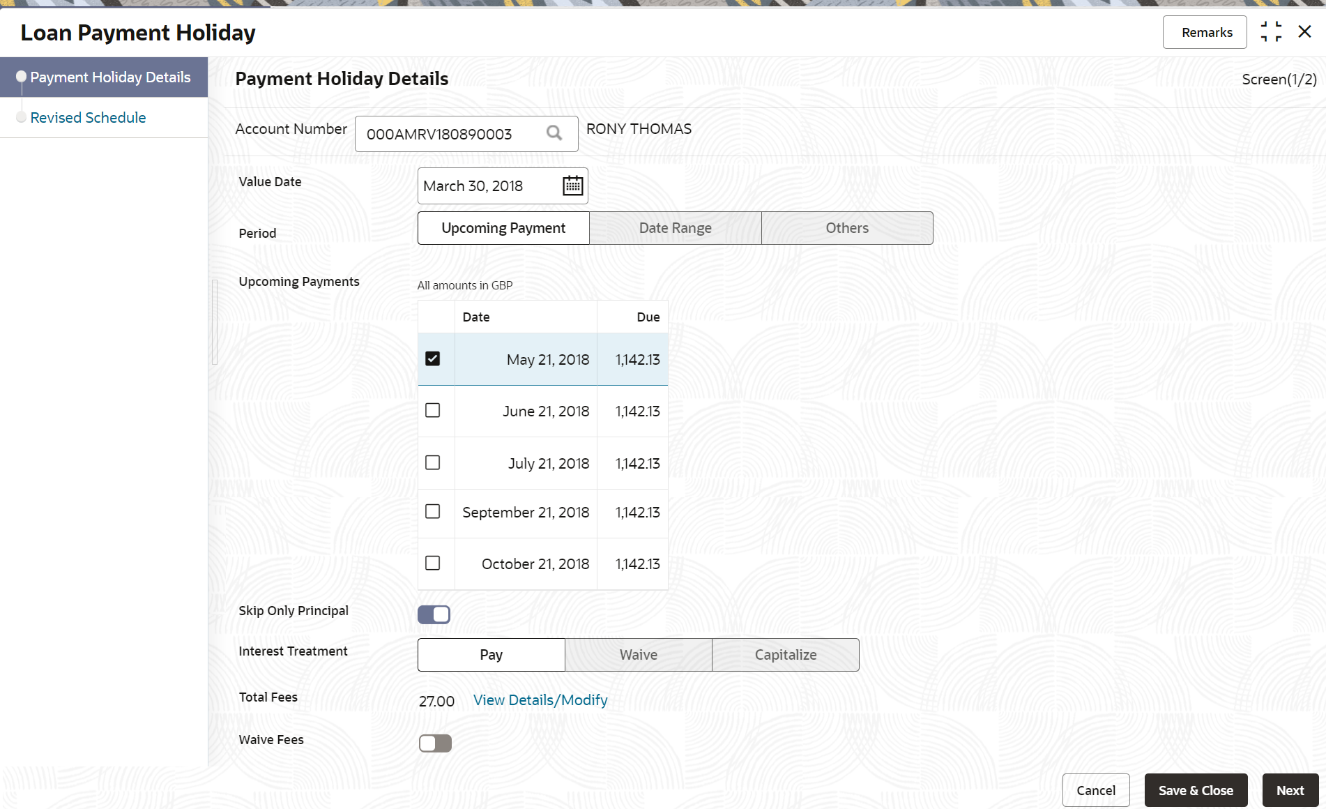Outstanding Principal is amortized for the remaining period or for the tenor of the loan. For Simple Loans (Bearing Loans), the interest schedules for the period is also skipped.Interest Treatment Select the appropriate option for treating the interest. The options are: - Pay
