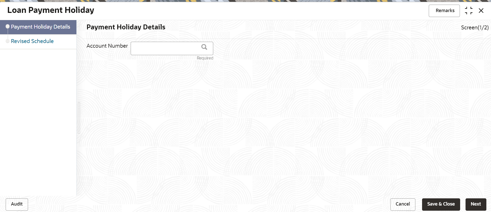 2. On the Loan Payment Holiday screen, click the Search icon or specify the account number in the Account Number field, and press Tab or Enter. For more information on search, refer Fetch Account Number.