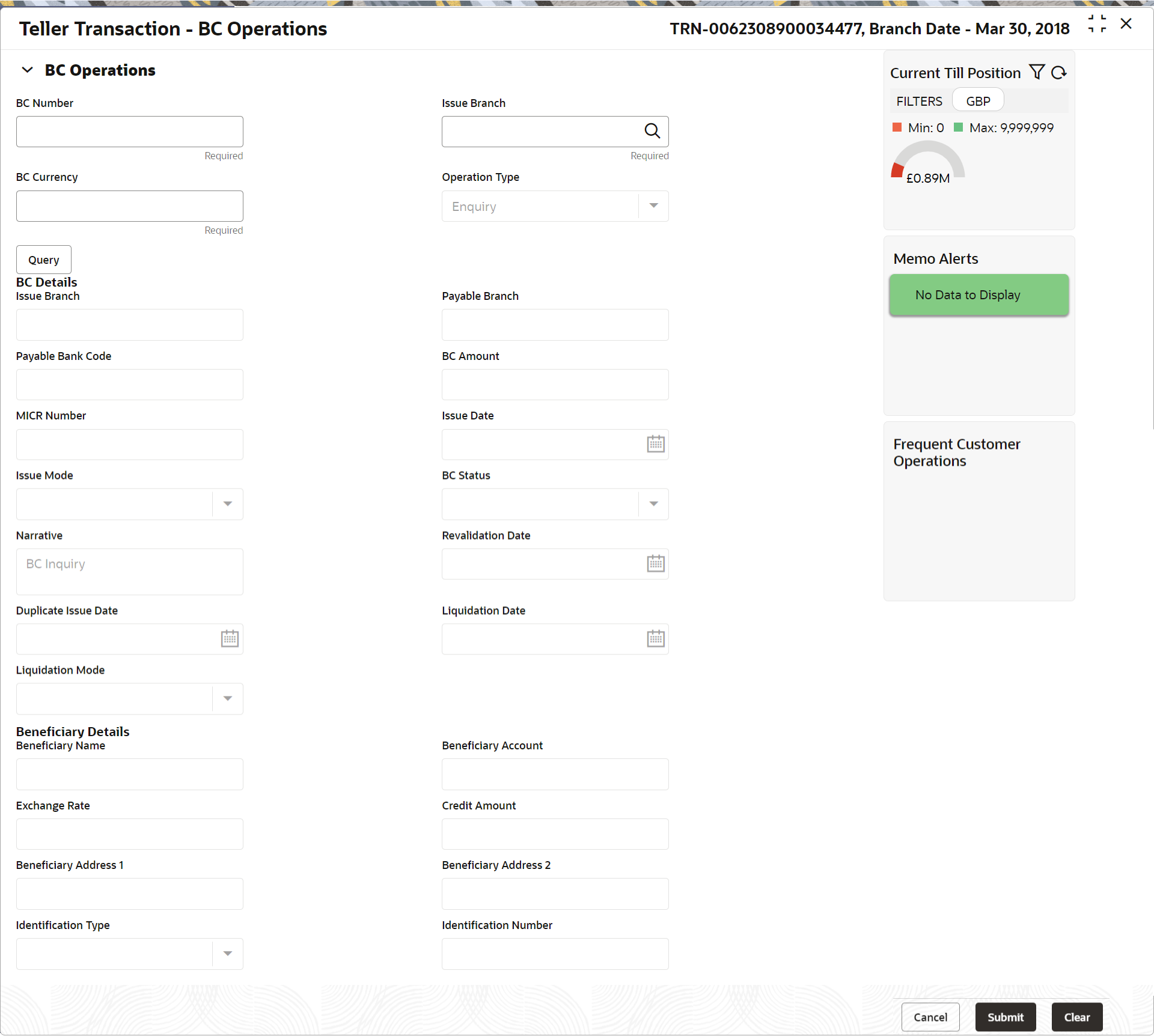 The Teller can use the BC Operations screen to inquire about the details of BC.