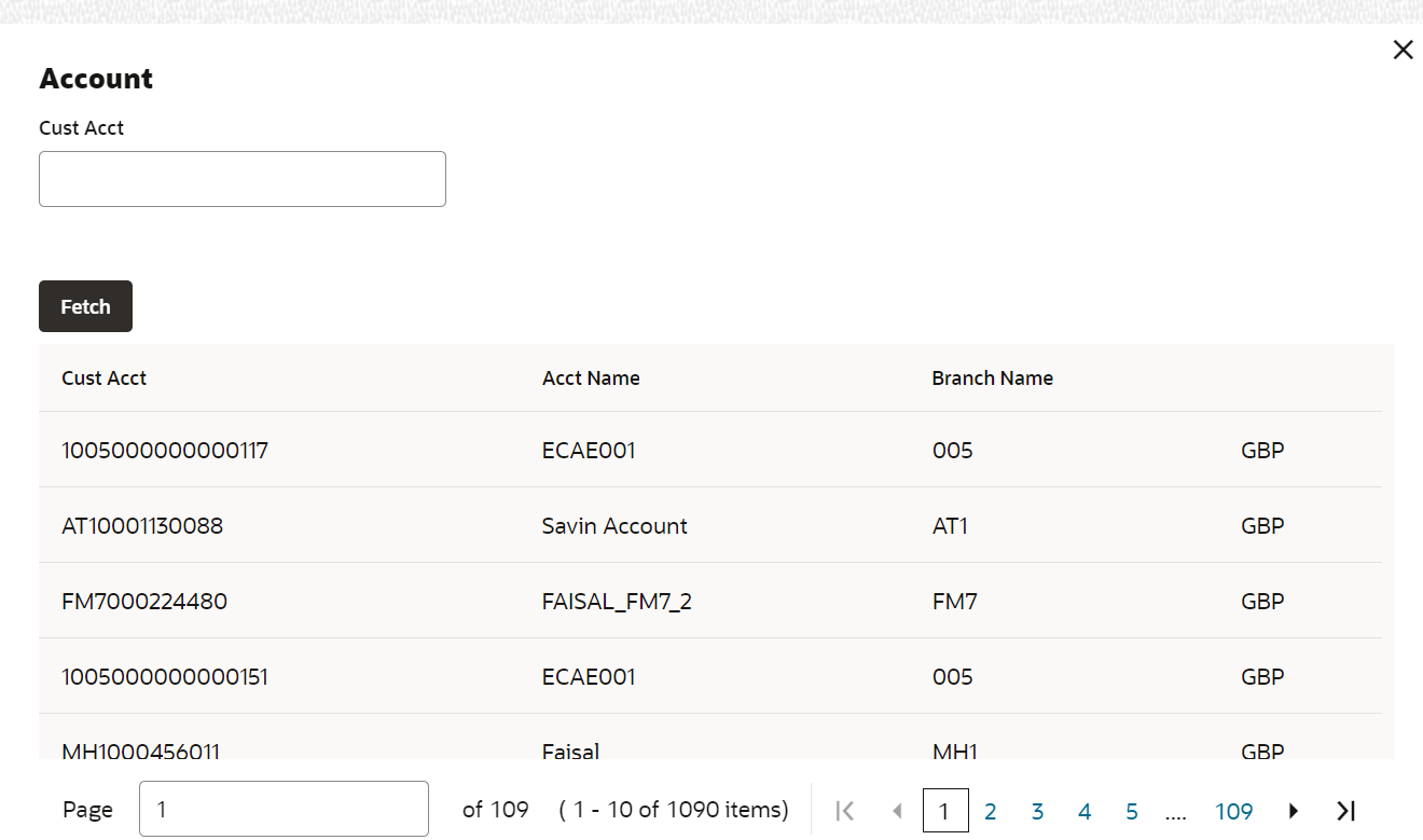 displayed. - Specify the code in the Cust Acct or Ledger Code field and click Fetch.