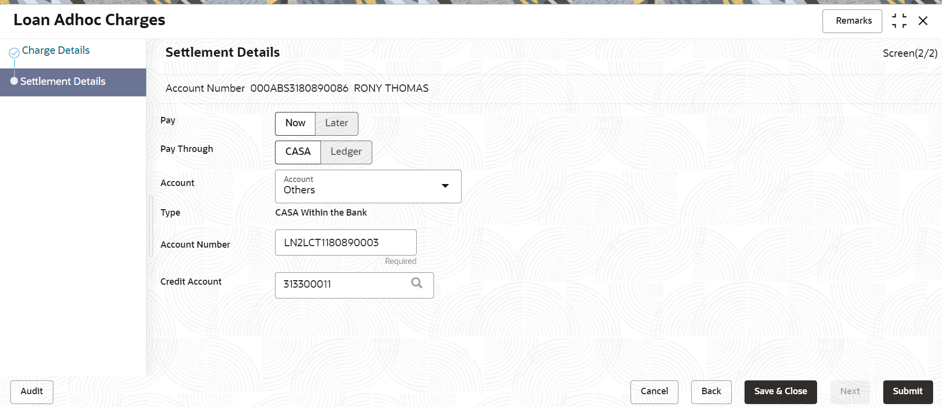 If you select Later option, then a message is displayed that the settlement will be done in the next payment transaction.Pay Through Select the CASA option to perform the settlement. Account Select the account from which the adhoc charges is to be settled. Note: