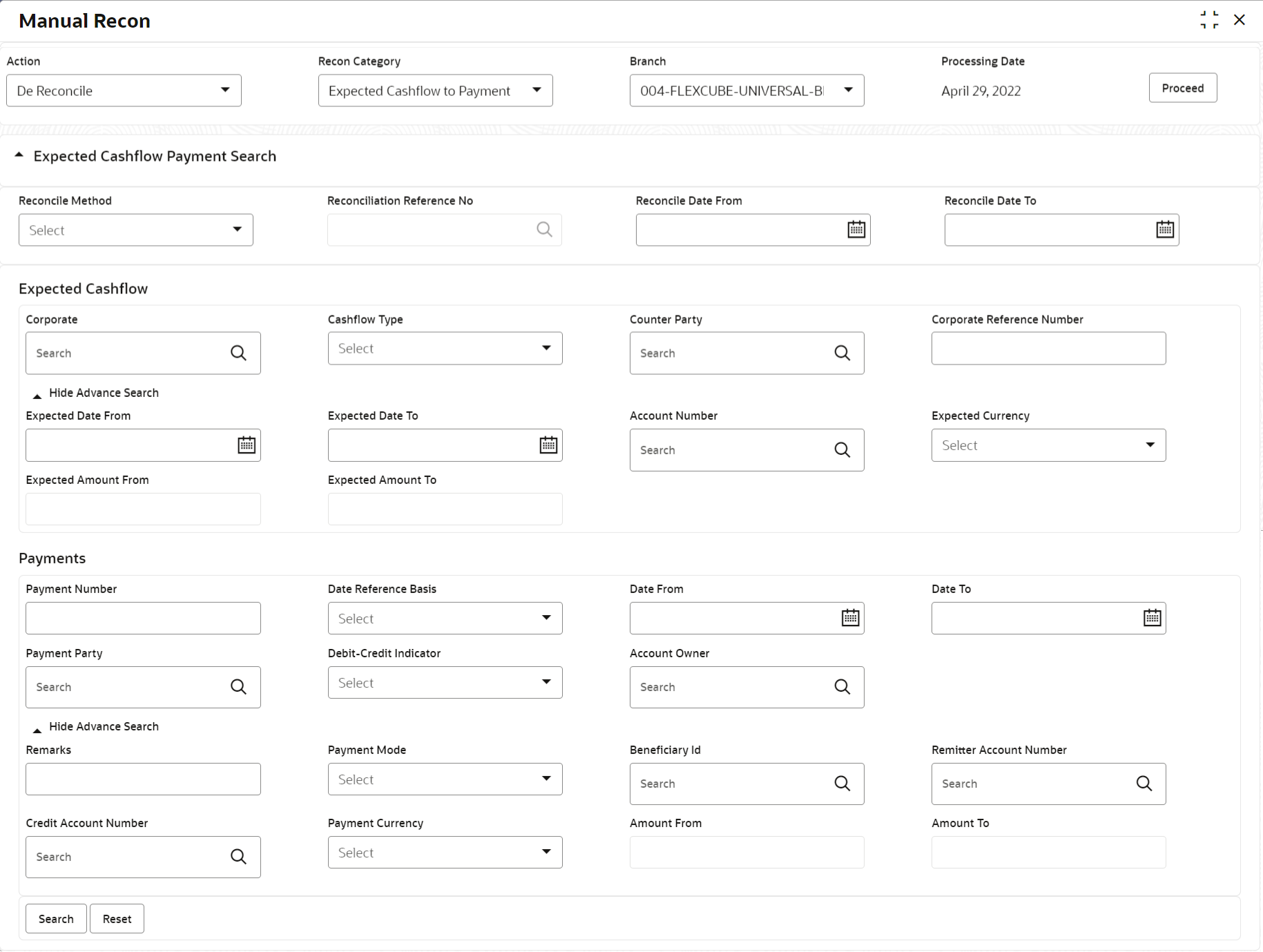 Reconciliation Reference No Click the Search icon to select the reconciliation reference number. This field is mandatory and displayed for only ‘Manual’ de-reconciliation method.