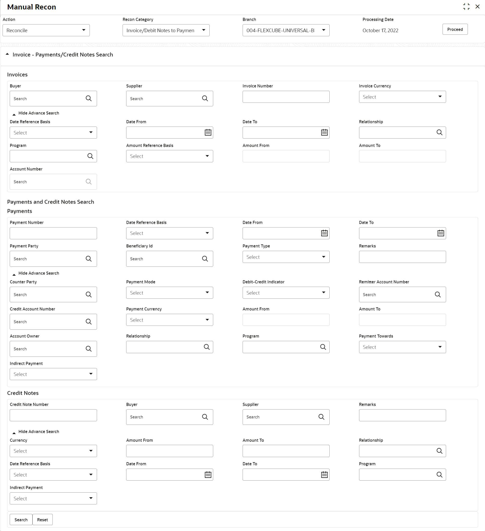 - Specify the fields on Manual Recon - Search screen.For more information on fields, refer to the field description table.