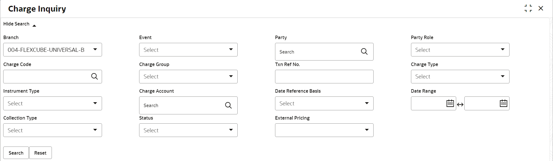 This topic describes the systematic instruction to inquire charges applied to the customer based on the various criteria such as Charge Type, Charge Account, Transaction Reference Number, Date range, etc.