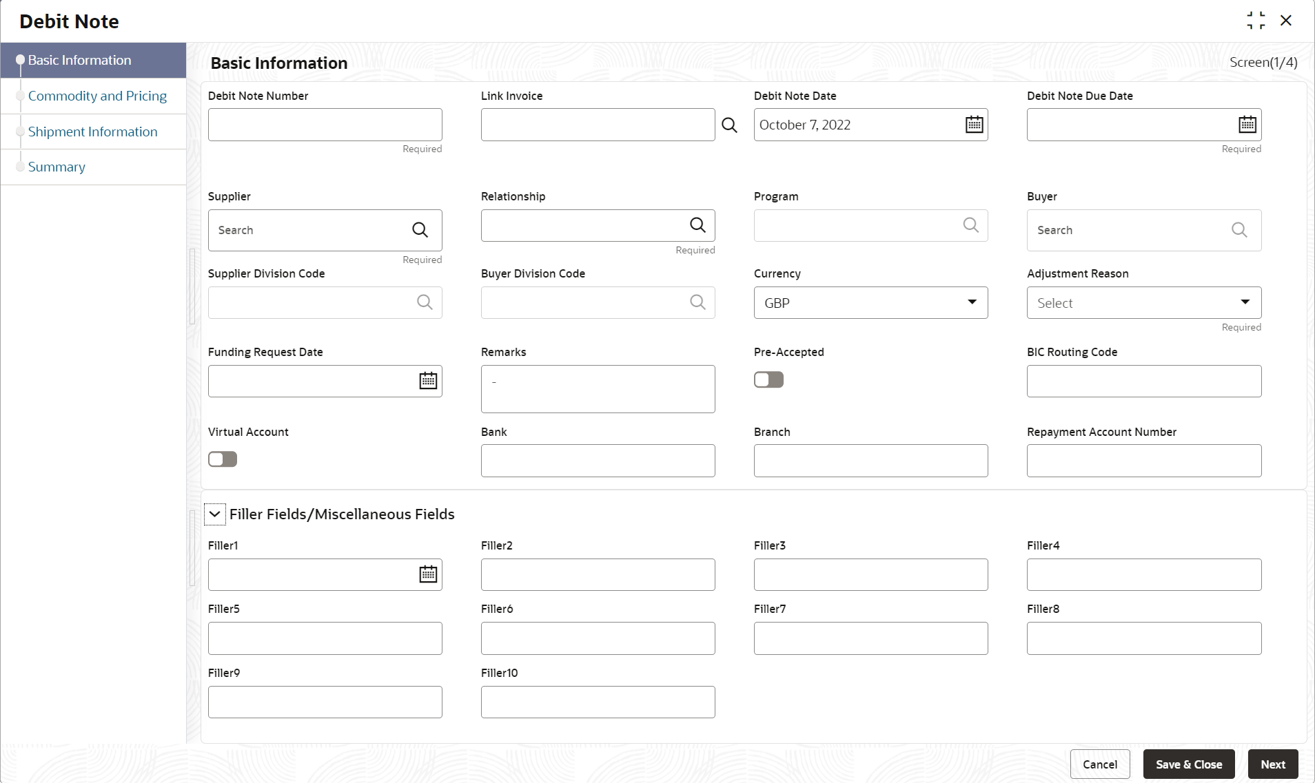 The Funding Request Date can be lesser than the system's current date only if the Allow Back-Dated Disbursement toggle is enabled in the System Parameters, Product Parameters, or Program Parameters.Remarks Specify the remarks about the debit note, if any. Pre-Accepted Switch the toggle ON if the debit note is pre-accepted by the buyer. BIC Routing Code Specify the BIC or SWIFT code of the financial institution, to send the payment amount to. Virtual Account Switch the toggle ON, if the repayment account is a virtual one. Bank Specify the bank name of the repayment account. Branch Specify the branch name of the repayment account. Repayment Account Number Specify the account number to send the repayment amount to. Filler Fields/Miscellaneous Fields Specify the desired values in the filler fields. The bank can configure these fields on Day Zero based on their requirement. - Perform any of the below action from the Basic Information screen: