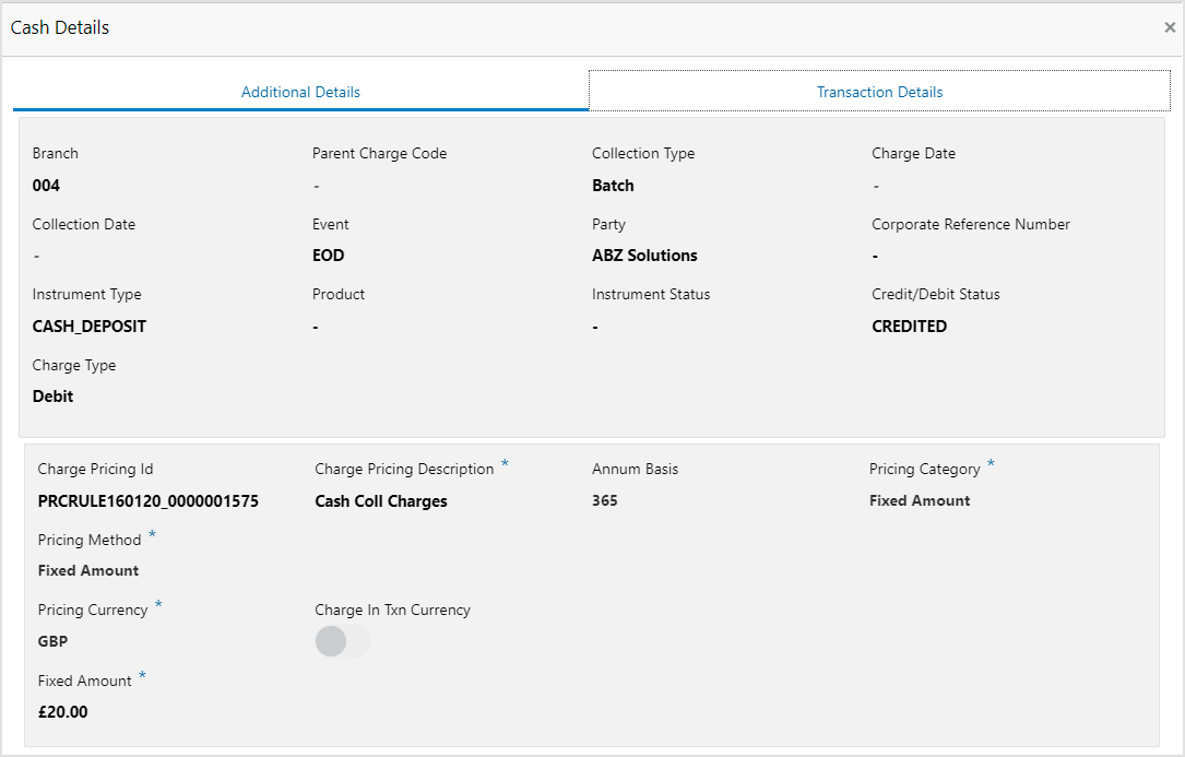 - Click on the hyperlinked data in the column(s) to view more details of the record.The Cash Details - Additional Details screen displays.